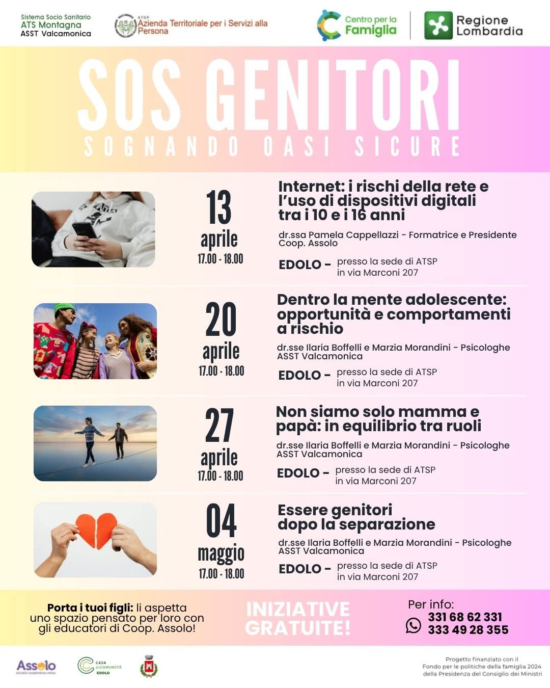 L'Azienda Territoriale per i Servizi alla Persona in collaborazione e con il patrocinio di: Comune di Edolo, ATS della Montagna, Centro per la famiglia, Regione Lombardia, Cooperativa Assolo, Casa di Comunità di Edolo, organizza quattro incontri dedicati a genitori ed educatori nelle serate di: