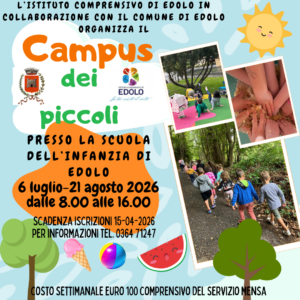 L’Istituto Comprensivo di Edolo in collaborazione con il Comune di Edolo attiverà l’"Asilo Estivo”- CRE, presso i locali della Scuola dell’infanzia “Felice Romelli” di Edolo in Via Santa Maria, nel periodo da lunedì 6 luglio a venerdì 21 agosto (dalle 8.00 alle 16.00).
